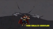 As he surveys his victory, Thor is suddenly attacked from behind by his evil step-brother, Loki. Thor, seeing who attacked him, pleads with Loki to return to the person Thor once knew, but the God of Evil simply laughs at him, telling him he had his chance to pick sides, and lunges with his spear. Using Mjolnir, Thor fights his brother, and gains the advantage. He is about to finish Loki off with a huge blast of energy, when Loki simply vanishes. Proclaiming that Loki cannot beat him, Thor is again attacked from behind by Loki, who tries his best to stop Thor. Having had enough, Thor simply deflects his brothers attacks, and captures Loki, bringing him before Odin.