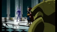 Thor is the first of Earth's heroes to confront the mad and very powerful Graviton, and is the first to witness his gravity-bending powers, which affect even the mighty Asgardian warrior. However, not one to back down, Thor continues to fight, until he is sent beneath the ocean by Gravitons power. He remains buried beneath the sand until the other heroes of Earth arrive, and distract Graviton enough for Thor to free himself. Rejoining the battle, Thor teams up with Iron Man, Ant-Man and Wasp in an attempt to stop Graviton. When Graviton lifts a huge portion of New York, which he is going to use to destroy the rest of the city, Thor uses Mjolnir to stop him, then flies down to catch the huge portion of earth and prevent it from causing a huge tidal wave which would have killed thousands. When they are all subdued by the insanely powerful villain, the Hulk arrives to aid them, and the battle shifts in their favor. In the end, after Hulk beats up Graviton, Wasp continues to sting him, Giant Man throws a huge ship on him, and Iron Man weakens him with a Uni-Beam, Thor unleashes his full power against the villain, and strikes him with a huge blast of lightning and magic, finally bringing the foe down (however, Wasp is the one to render him unconscious with a final sting when Thor's attack is done). After their victory, Thor group-hugs the informal team, but then S.H.I.E.L.D. arrives to re-capture the Hulk, who had been freed from the Cube along with most of Earth's villains.