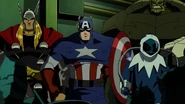 Thor and Iron Man searched for Hulk with Wasp and Ant Man in the Quinjet. Thor told Iron Man he should rely on his instincts then on technology, but just as he said that Iron Man found a frozen Captain America, who was still alive. When Captain America was thawed out, he immediately started to attack the Avengers. When Wasp showed him his and Bucky’s memorial, he learns that he had been frozen for several decades. Realizing the world needed him again, he joined the Avengers.[1]