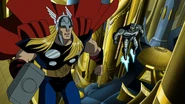 He arrives at the scene of the fight just as one of the Giants is about to kill Sif. He breaks the creature's axe just as it is about to crush the female Asgardian, then confronts another Giant who is armed with a sword. As they battle, causing massive property damage to Asgard in the process, Odin sees through his ravens that Thor has arrived and breathes a sigh of relief. Thor continues to battle the Giants and is about to finish them off when he is suddenly frozen by an unseen foe. He easily breaks free but is pummeled by the remaining Giants. Just as one is about to bite his head off, Thor comes to and calls Mjolnir to him, just barely escaping the Giant's teeth. He then proceeds to defeat the Giants with a massive bolt of lightning.